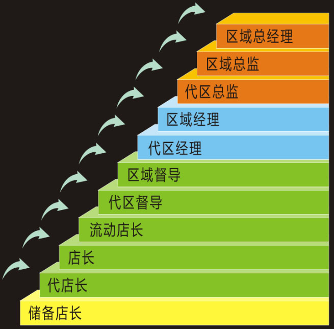 储备店长—代店长—店长—流动店长—代区督导—区域督导—代区经理—区域经理—代区总监—区域总监—区域总经理等更高职位;